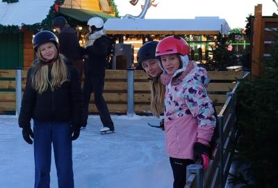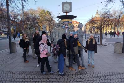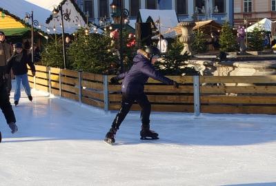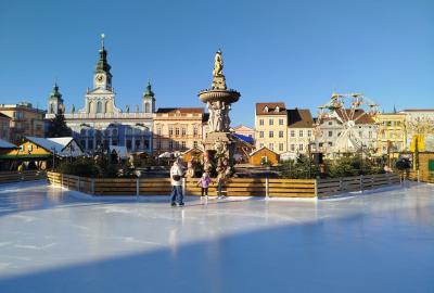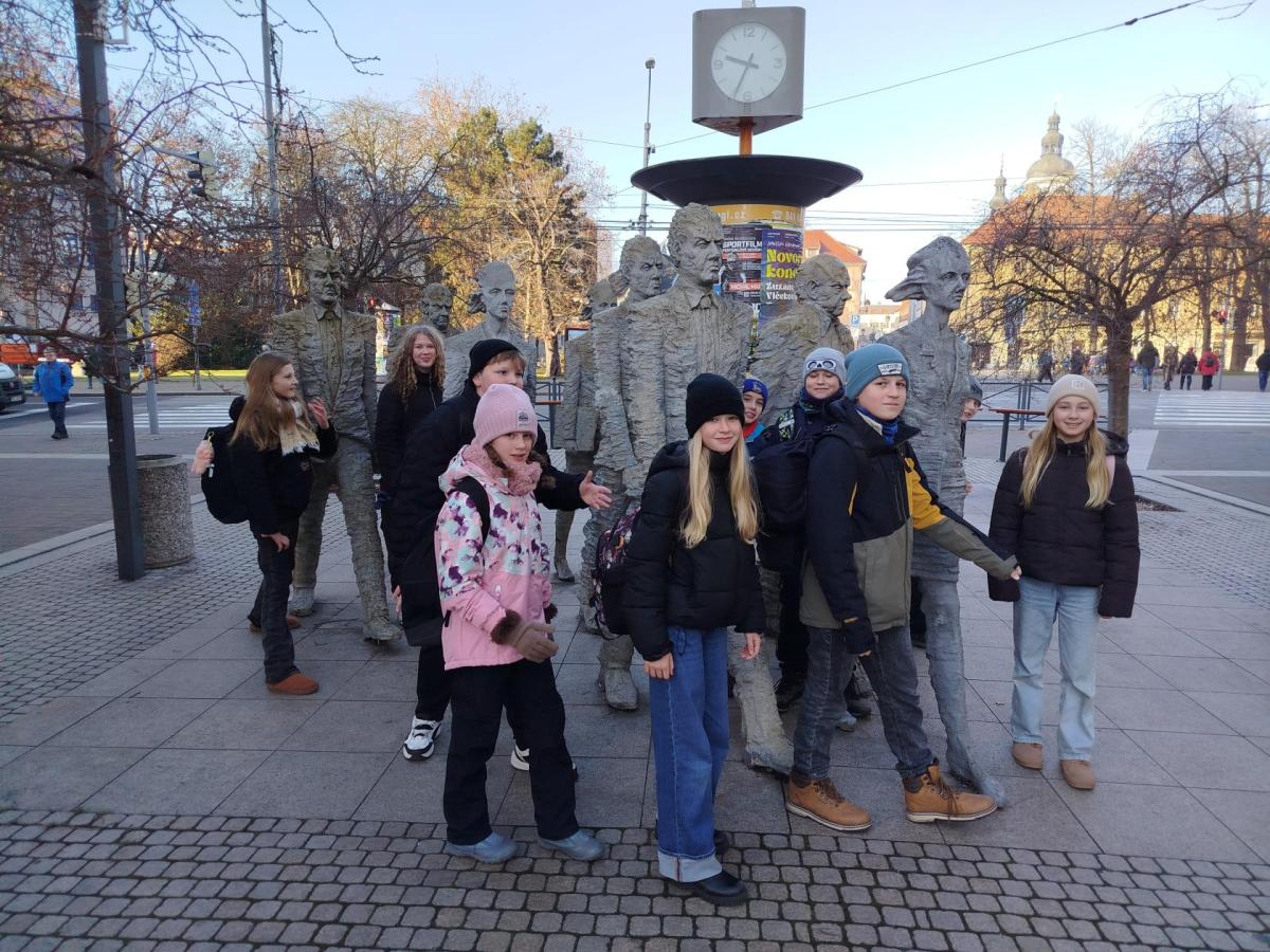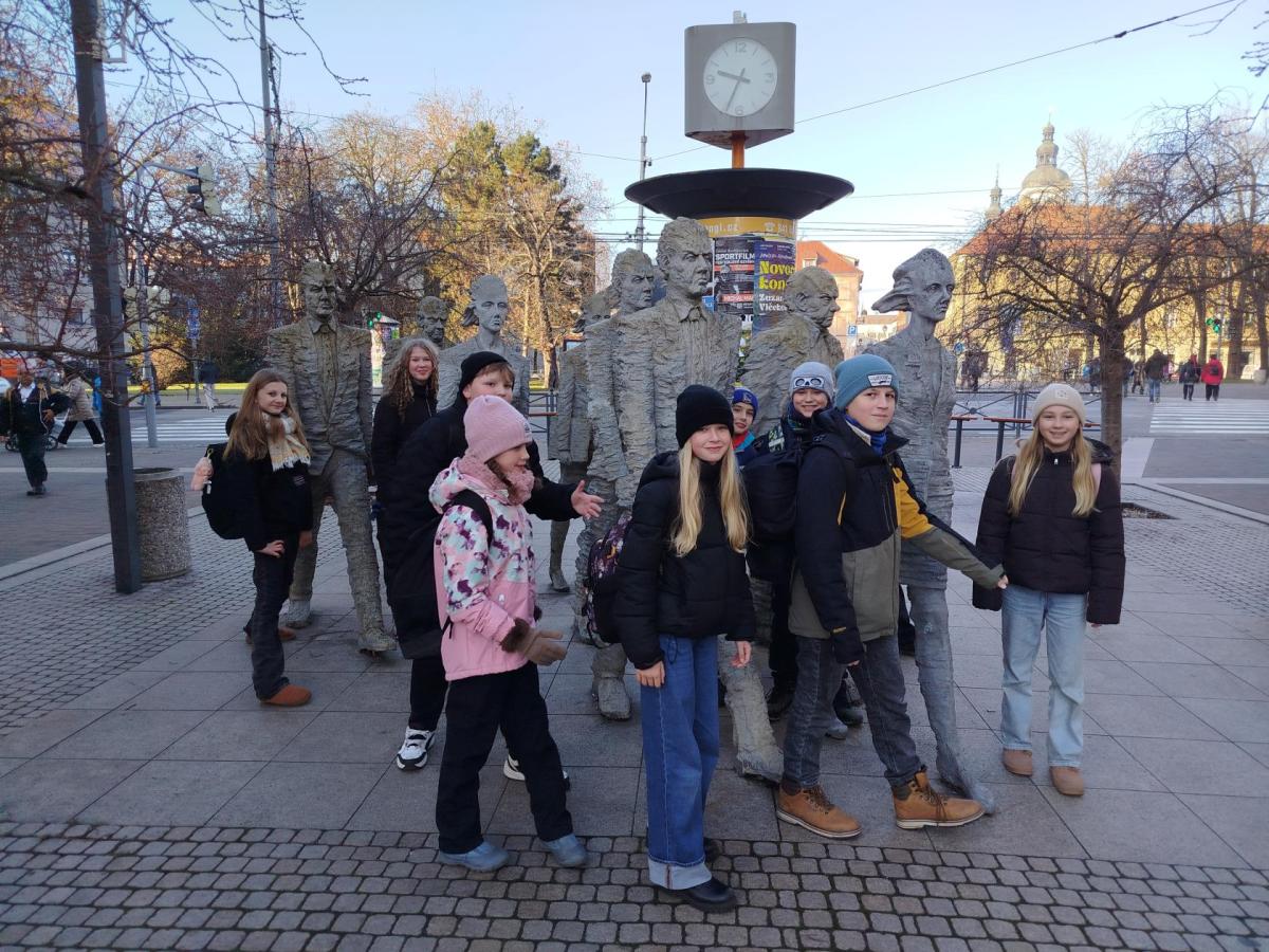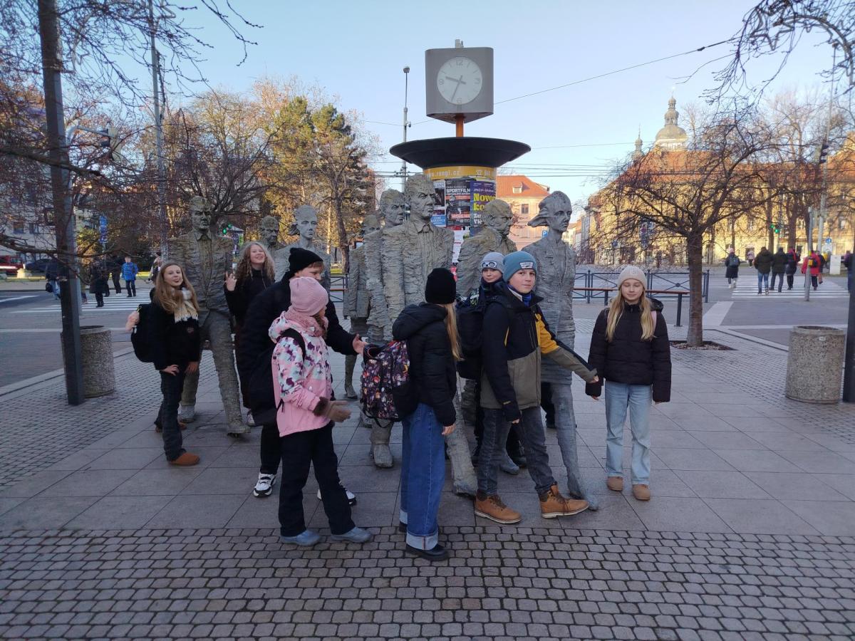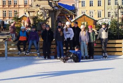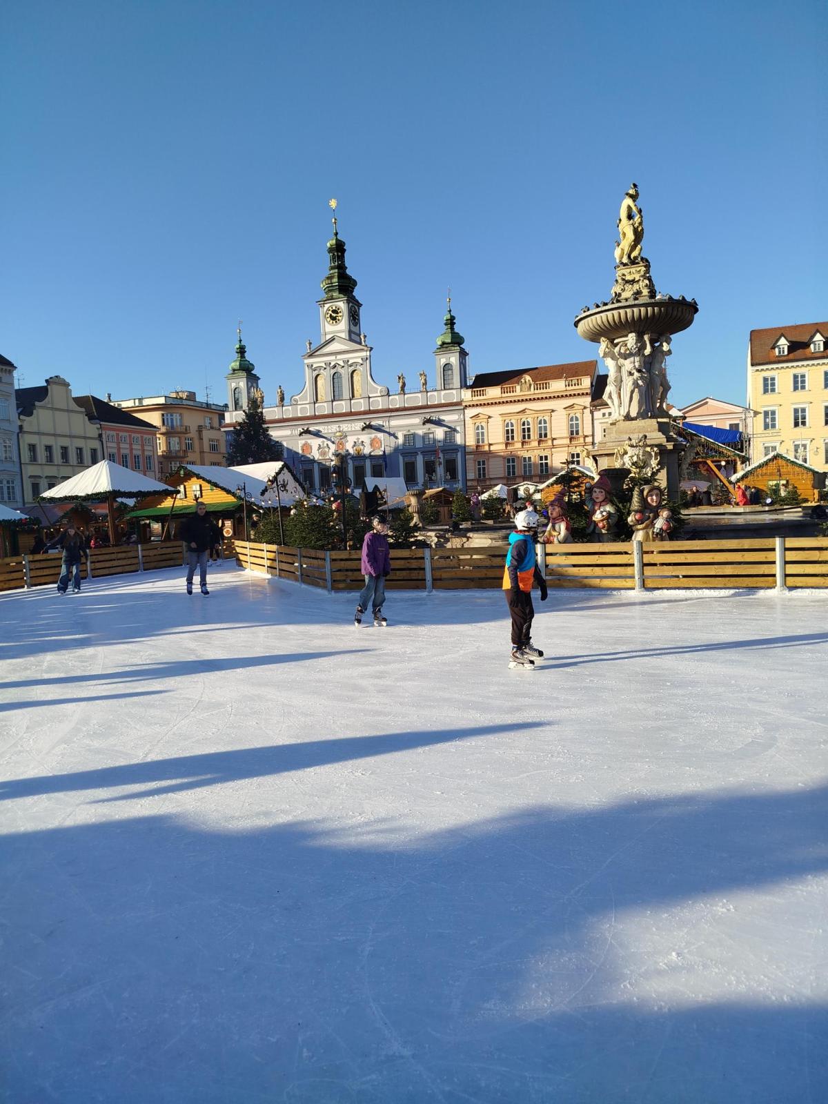 V Č. Budějovicích jsme na Lannově třídě narazili na Humanoidy a hned jsme začali tvořit fotodokumentaci naší výpravy. Po krátké procházce parkem byla naší další zastávkou perníková chaloupka. Naštěstí bez obyvatelky, takže jsme mohli ve stejném počtu pokračovat směr náměstí Přemysla Otakara II. U Černé věže jsme navštívili katedrálu sv. Mikuláše a poté spěchali za cílem naší cesty. Tím bylo kluziště, které obklopovalo celou Samsonovu kašnu. Sluníčko stále svítilo, modrá obloha - takže už jen zbývalo obout brusle a vyrazit. Všechny děti vybaveny vlastními nebo půjčenými bruslemi si celou hodinku super užily.