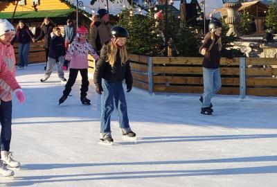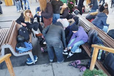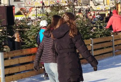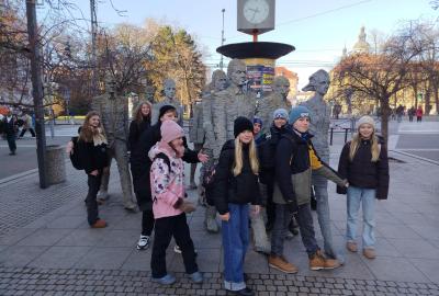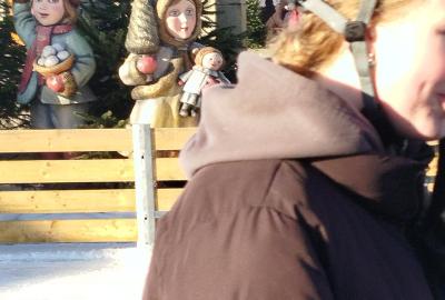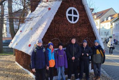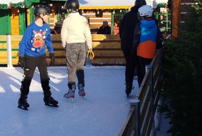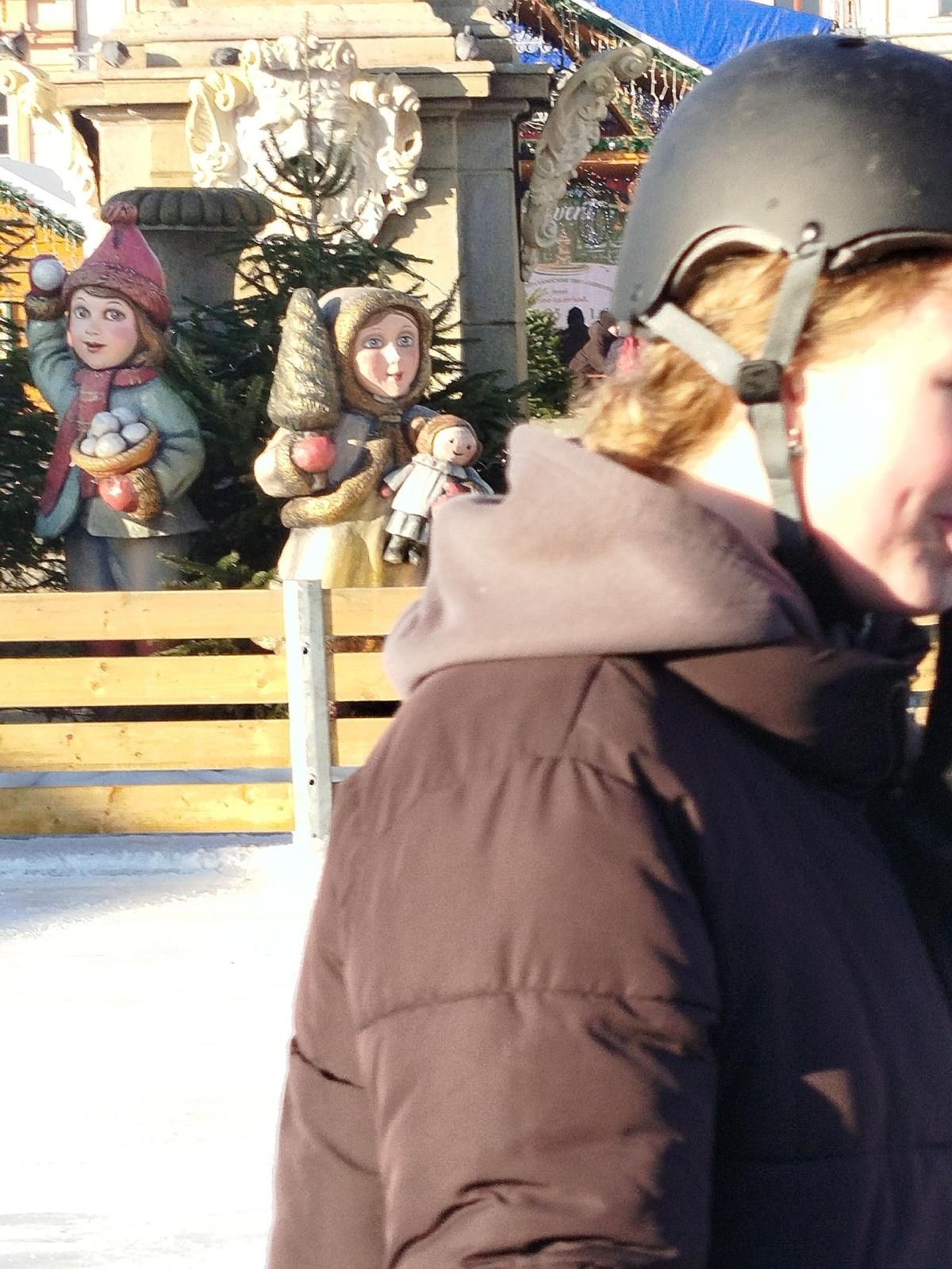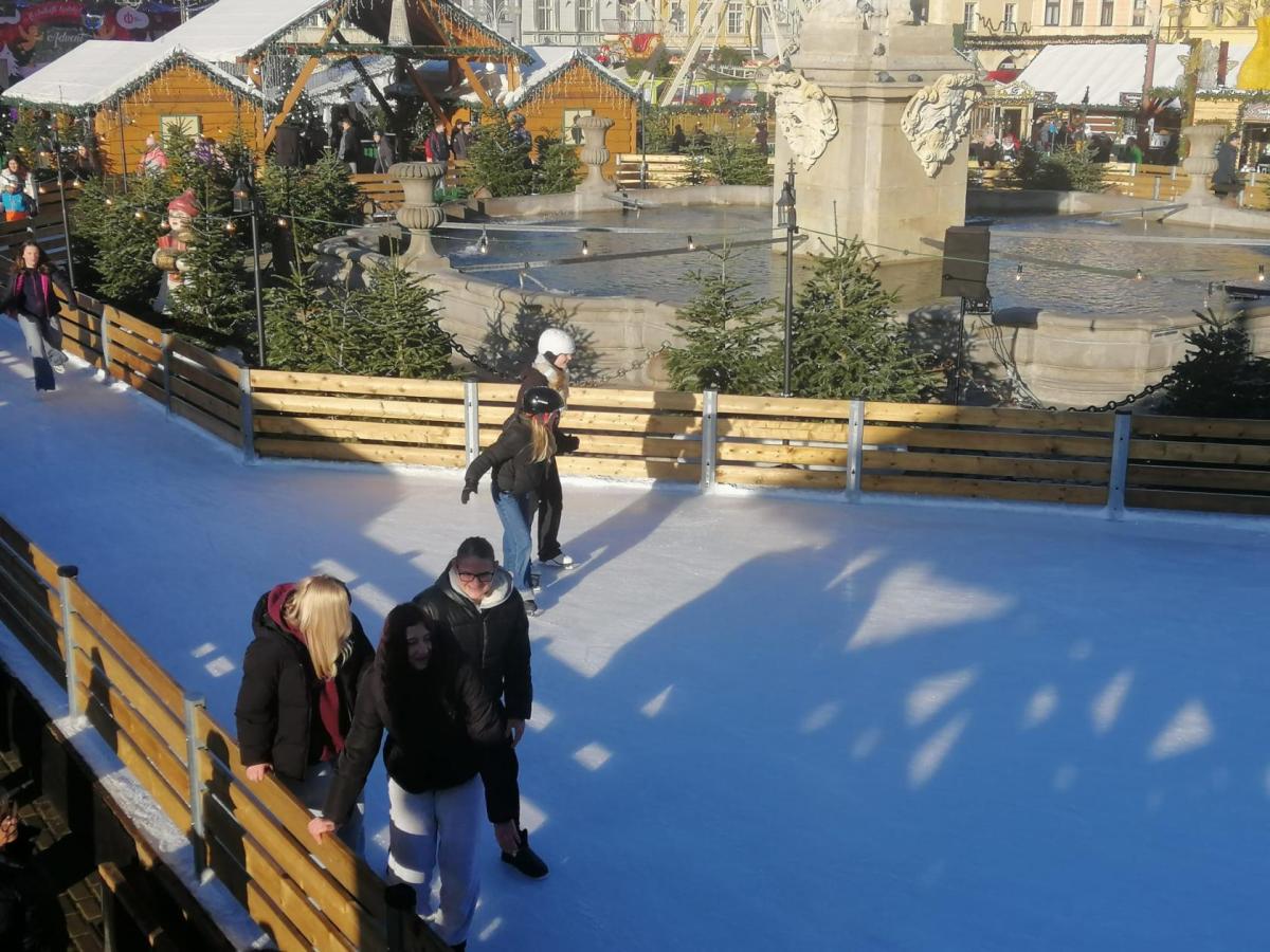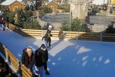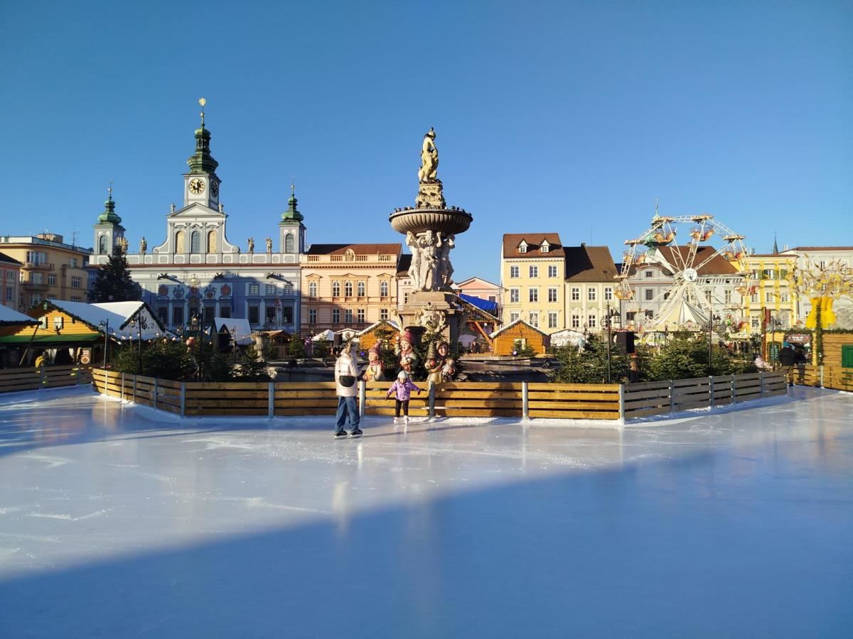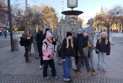 V Č. Budějovicích jsme na Lannově třídě narazili na Humanoidy a hned jsme začali tvořit fotodokumentaci naší výpravy. Po krátké procházce parkem byla naší další zastávkou perníková chaloupka. Naštěstí bez obyvatelky, takže jsme mohli ve stejném počtu pokračovat směr náměstí Přemysla Otakara II. U Černé věže jsme navštívili katedrálu sv. Mikuláše a poté spěchali za cílem naší cesty. Tím bylo kluziště, které obklopovalo celou Samsonovu kašnu. Sluníčko stále svítilo, modrá obloha - takže už jen zbývalo obout brusle a vyrazit. Všechny děti vybaveny vlastními nebo půjčenými bruslemi si celou hodinku super užily.