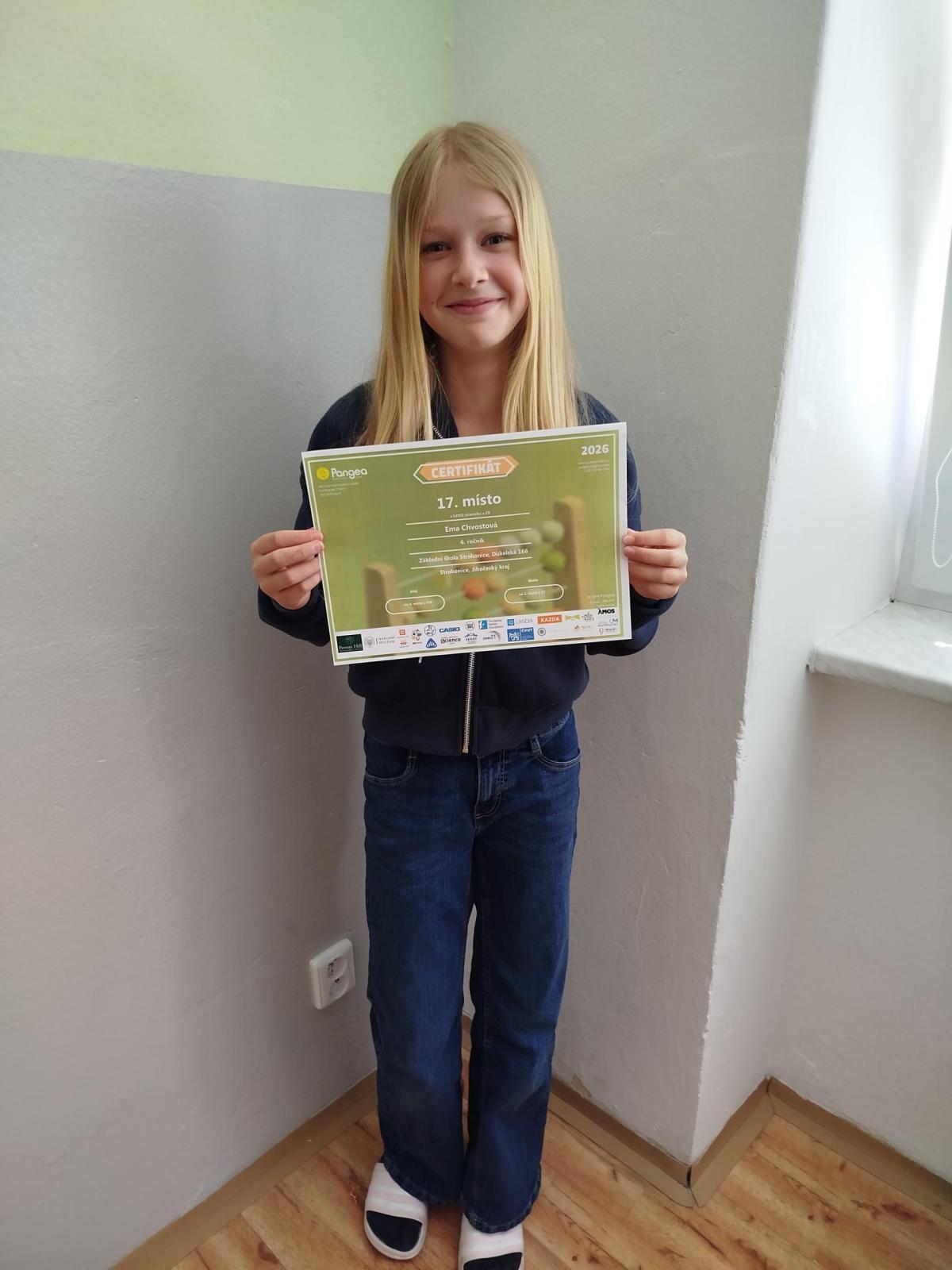 Na druhém stupni se matematické třídy každý rok účastní soutěže Pangea. Letošního fantastického výsledku dosáhla Ema Chvostová, která z celkového počtu 14503 účastníků z celé republiky obsadila skvělé 17. místo (v kraji soutěžilo 938 žáků a Ema byla na 4. příčce) a postoupila do celostátního kola, které proběhne v pátek 12. 6. 2026 v Praze.