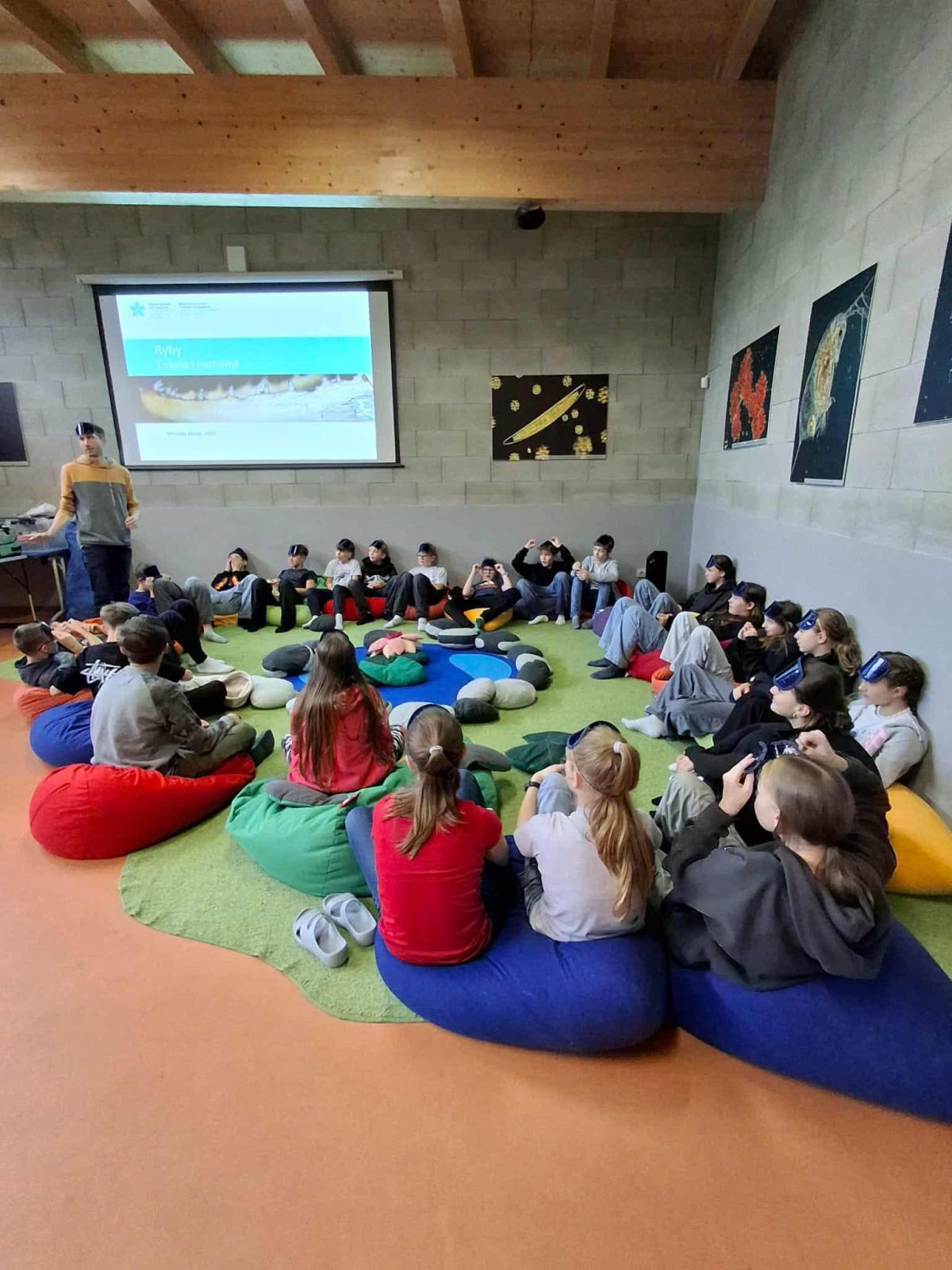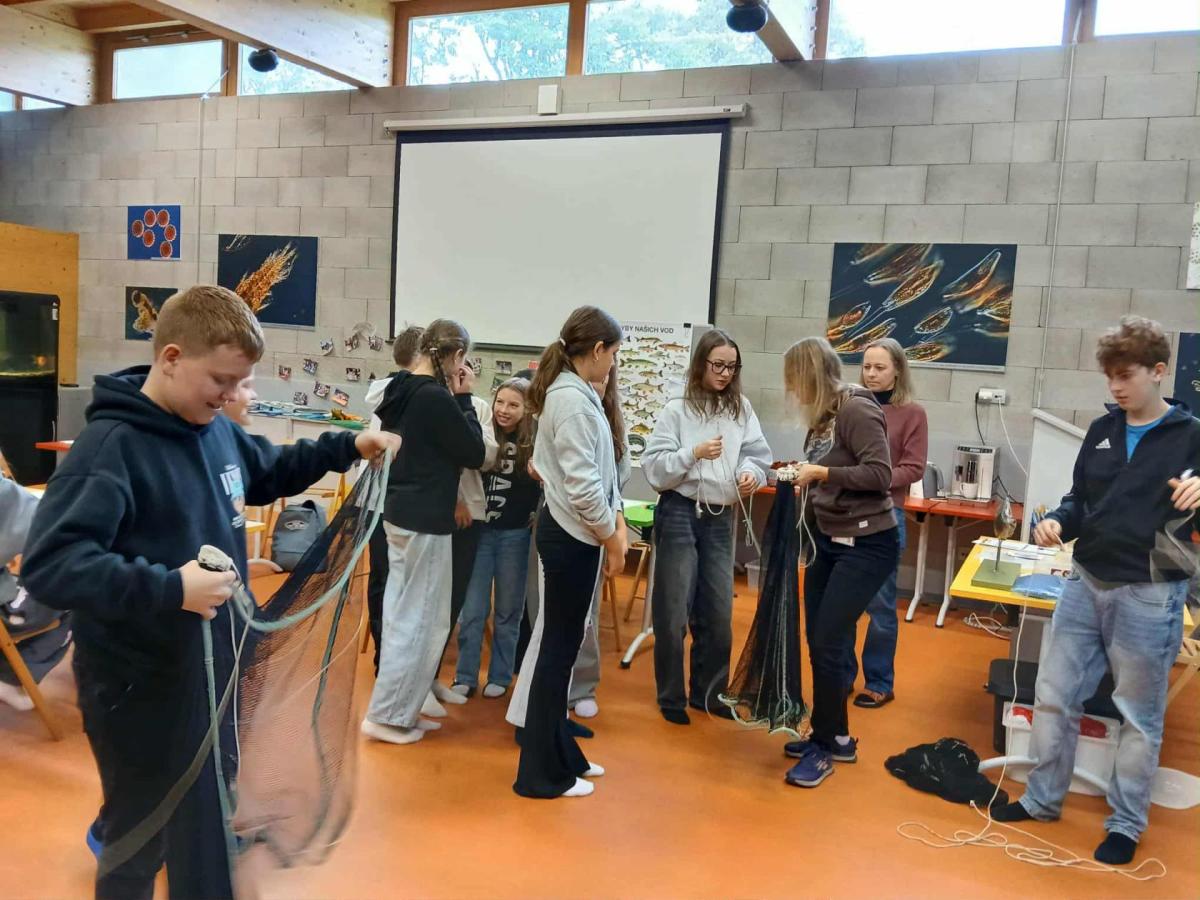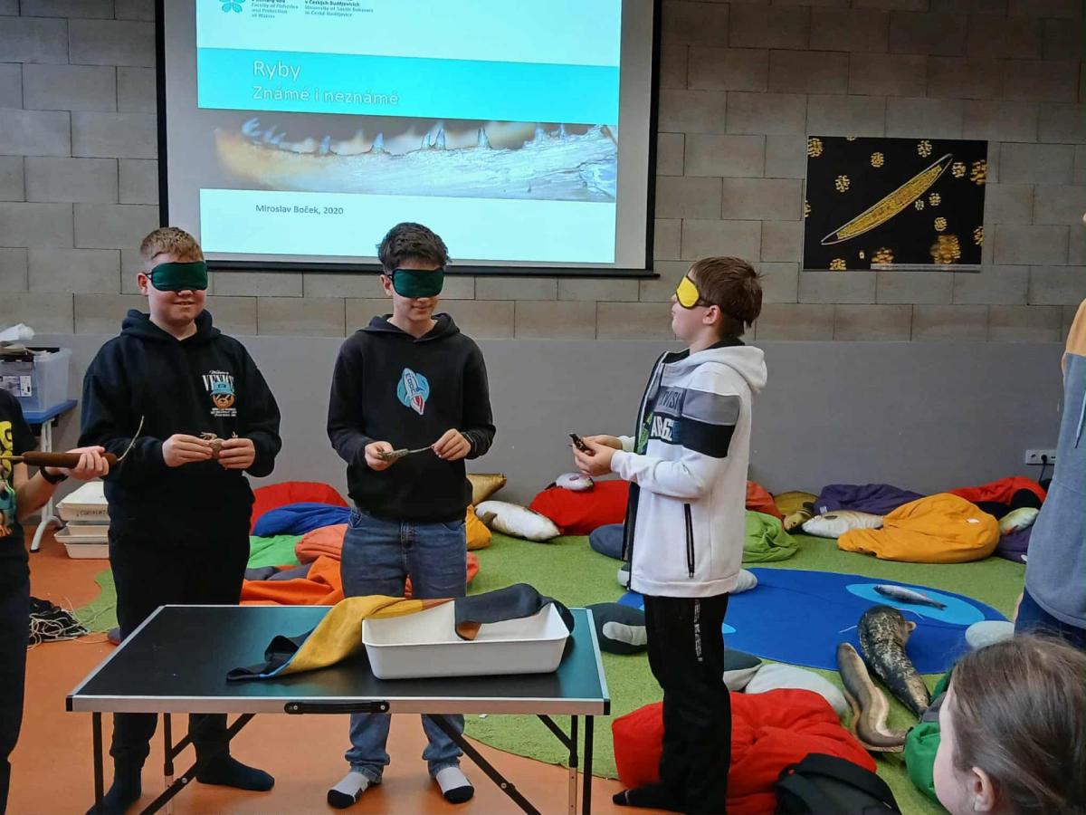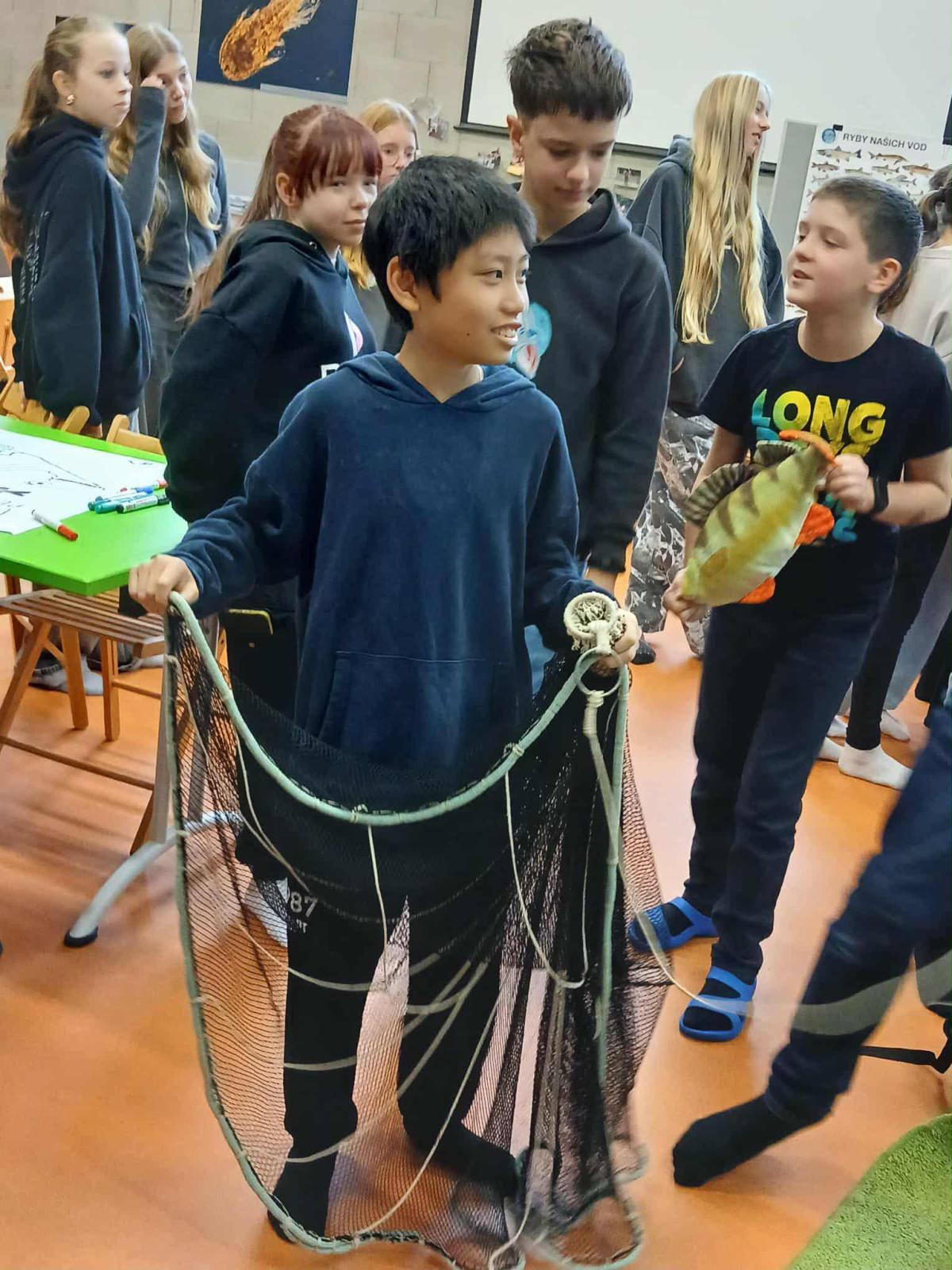 Čekání na praktickou část si zkrátili na interaktivním hřišti MEVPISu, kde si mohli vyzkoušet různé ekologické a přírodovědné hry. Poté už na nás čekaly ryby, raci a především úžasný pan lektor, který měl připravený program plný zajímavostí.