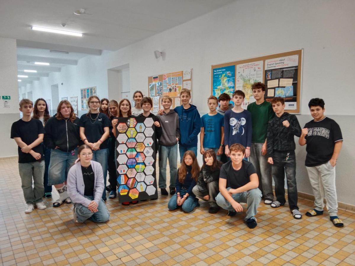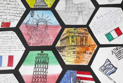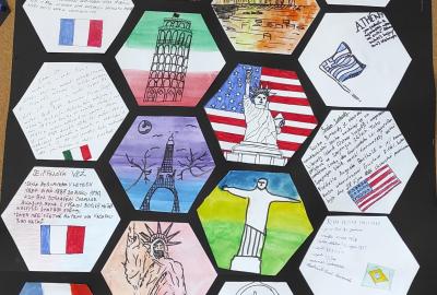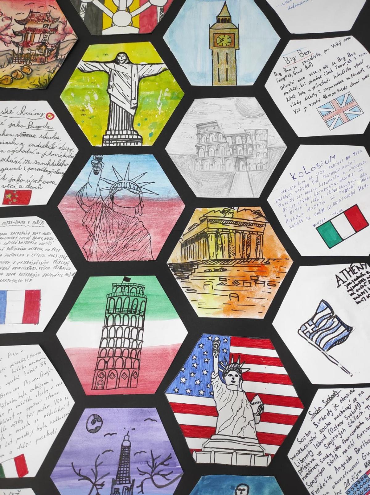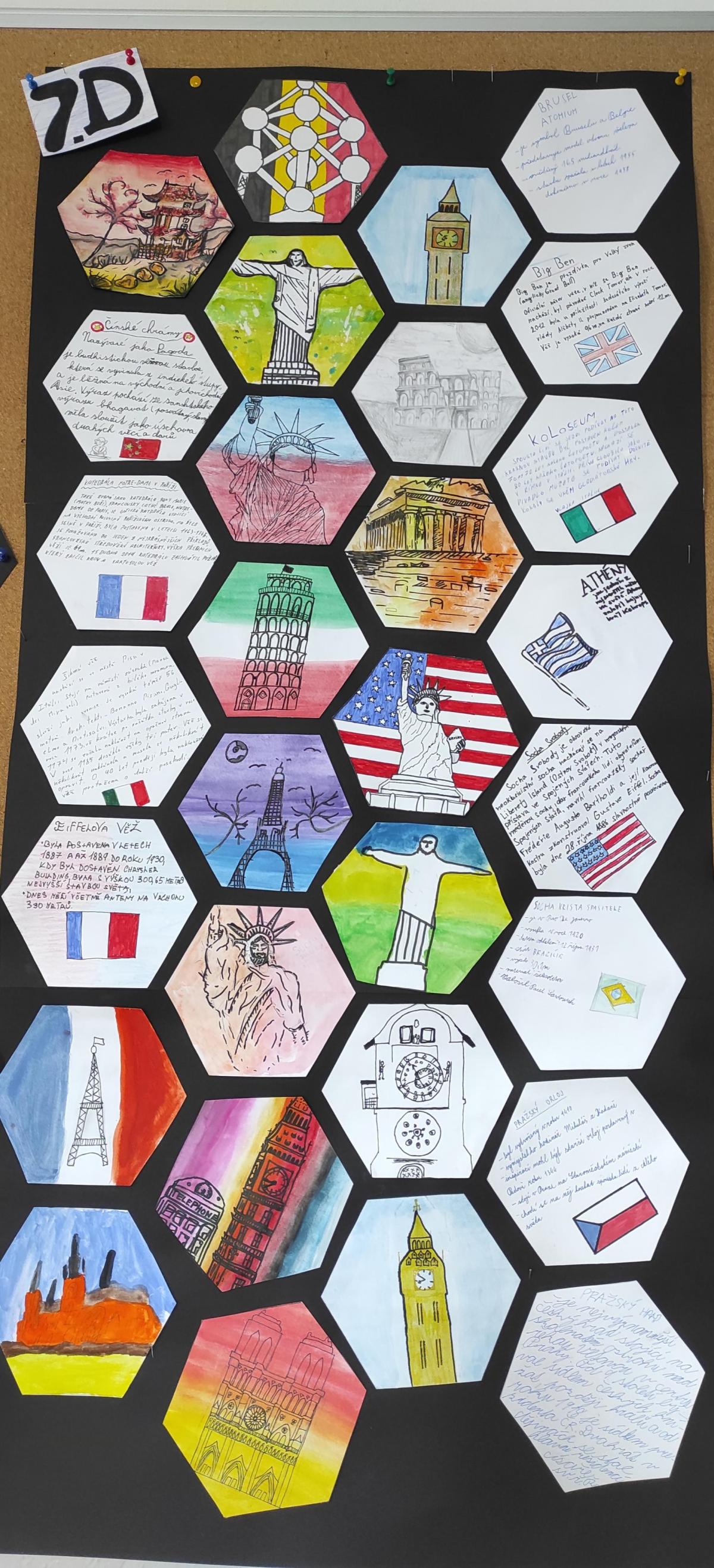 V hodinách výtvarné výchovy jsme vytvořili včelí plástev vyplněnou světovými stavbami a místy, které toužíme navštívit. K ilustraci každý vytvořil přehledné informace. V další hodině jsme pro vrstevníky ze sousedních tříd vymysleli a vytiskli naše originální osmisměrky a křížovky, kde si každý může hravou formou ověřit své zeměpisné znalosti.
