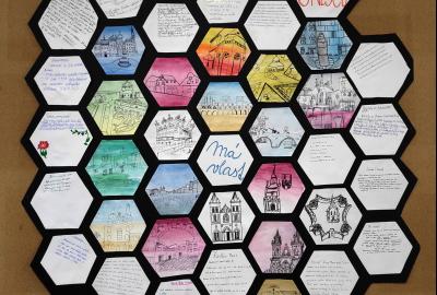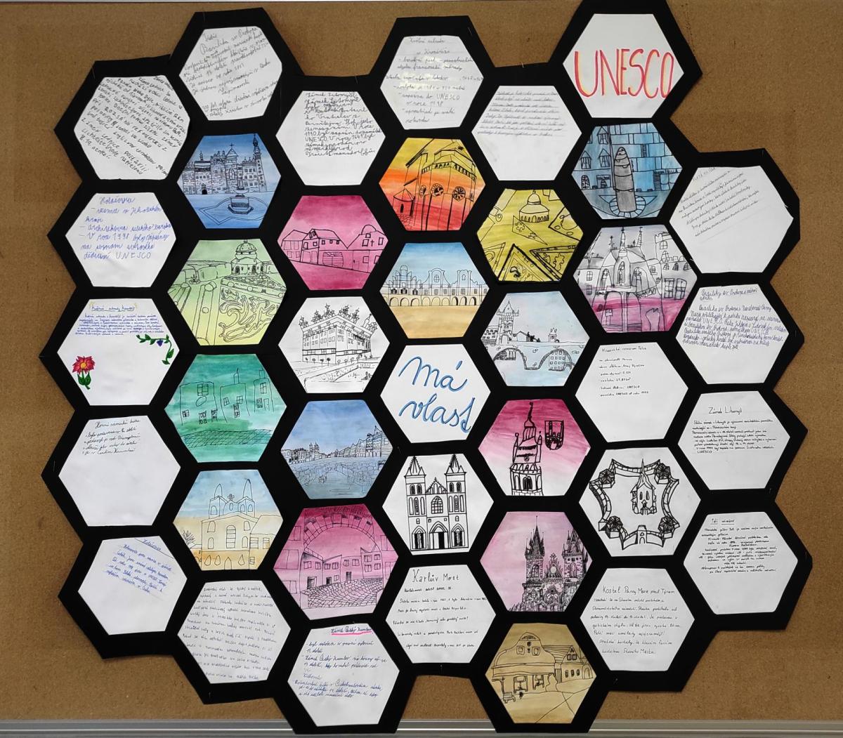 V hodinách výtvarné výchovy jsme společně vytvořili včelí plástev vyplněnou světovými stavbami a místy, které toužíme navštívit nebo které známe z hodin dějepisu a zeměpisu. K ilustraci každý vytvořil přehledné informace.